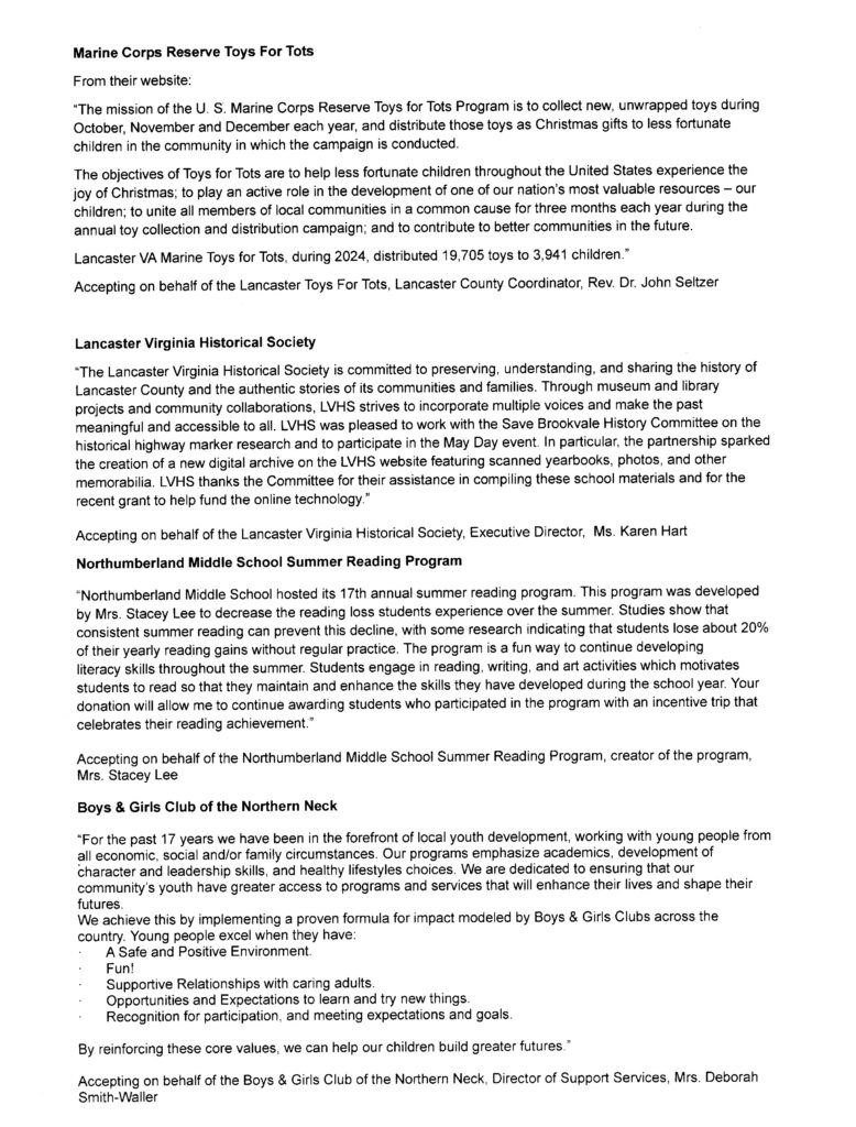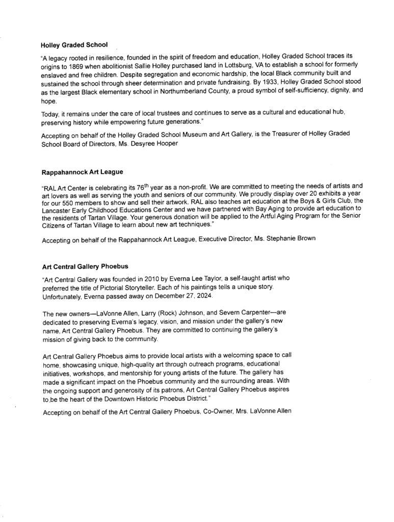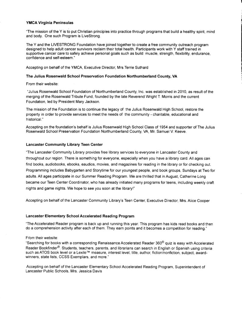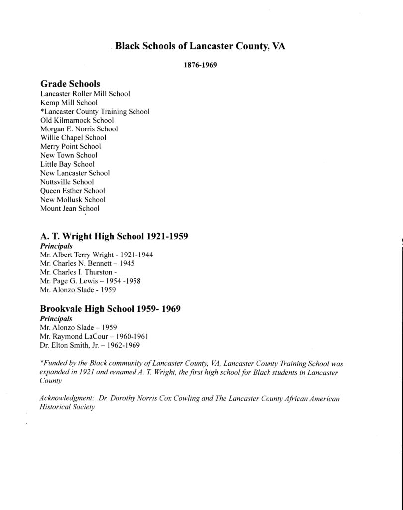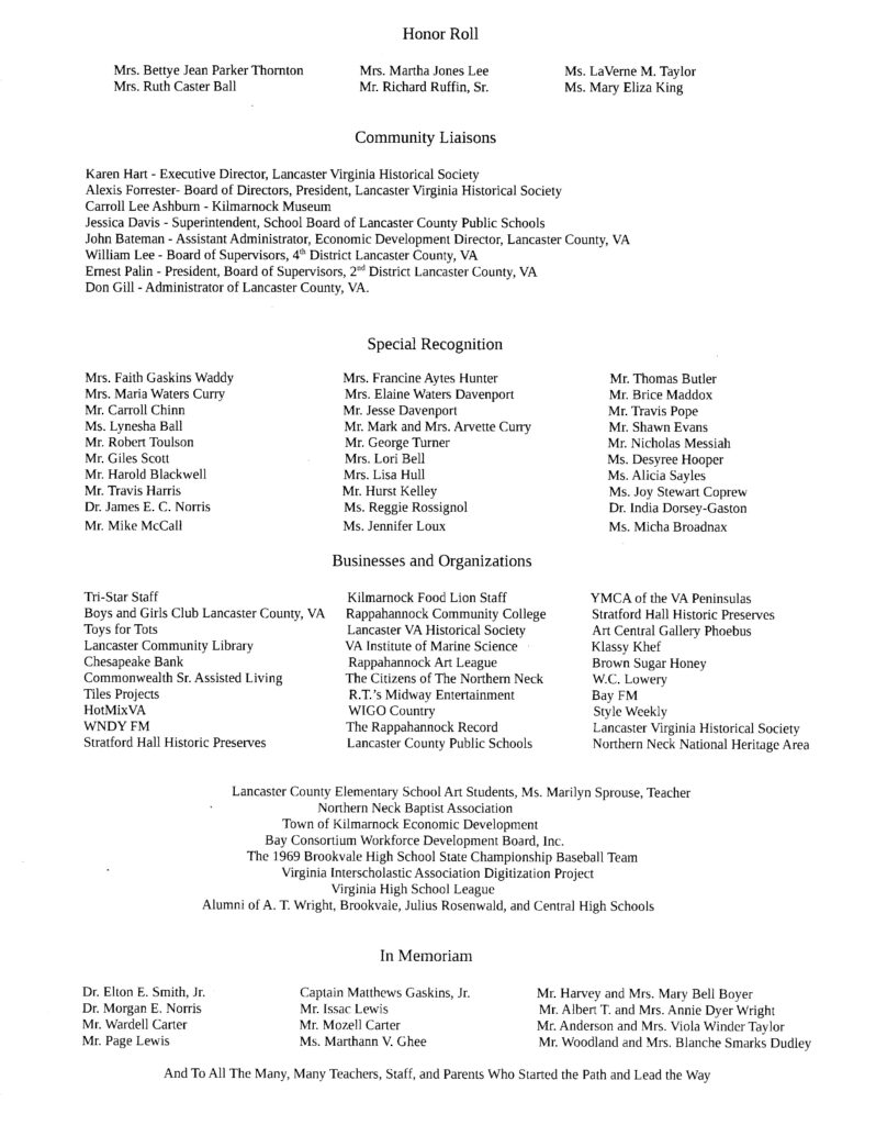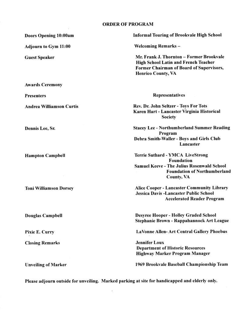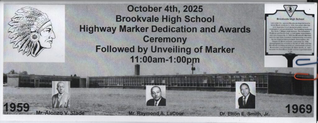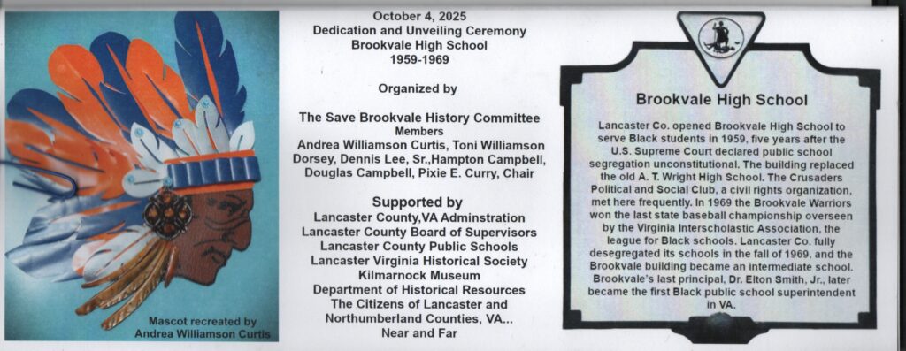 Much was accomplished and many came to witness the installation of the marker that will ensure the legacy of our beloved Brookvale High School. The program, a speech from the chair of the committee, information from the awards ceremony recognizing organizations that aligned with the philosophy and visions of Brookvale High School, and a beautiful wall plaque, designed by Cristiane Cockrell of Titles Projects that was presented to the superintendent of Lancaster County Public Schools, and William Lee, member of Lancaster County, VA Board of Supervisors, hopefully to be placed in the new middle and high schools for all to remember the Black schools that served so well during the years of segregation…may those time served as a valuable lesson for the future; all of this are here for your viewing.
