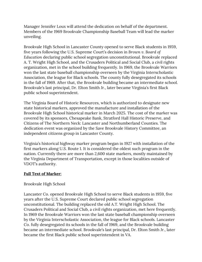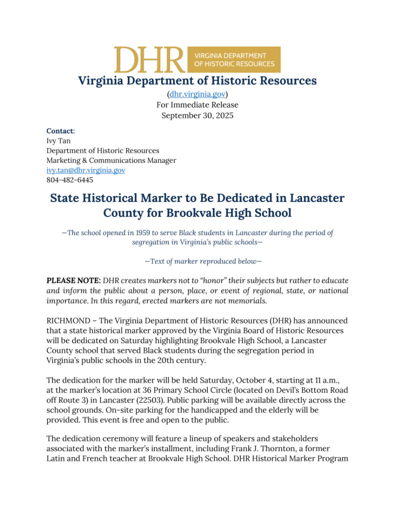 The Save Brookvale History Committee formally announces the dedication ceremony for the unveiling of the historical highway marker for Brookvale High School on October 4th, 2025 at 11am-1pm at 36 Primary School Circle, Lancaster, VA 22503.